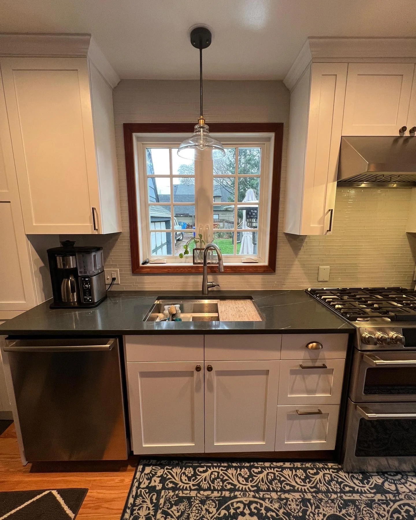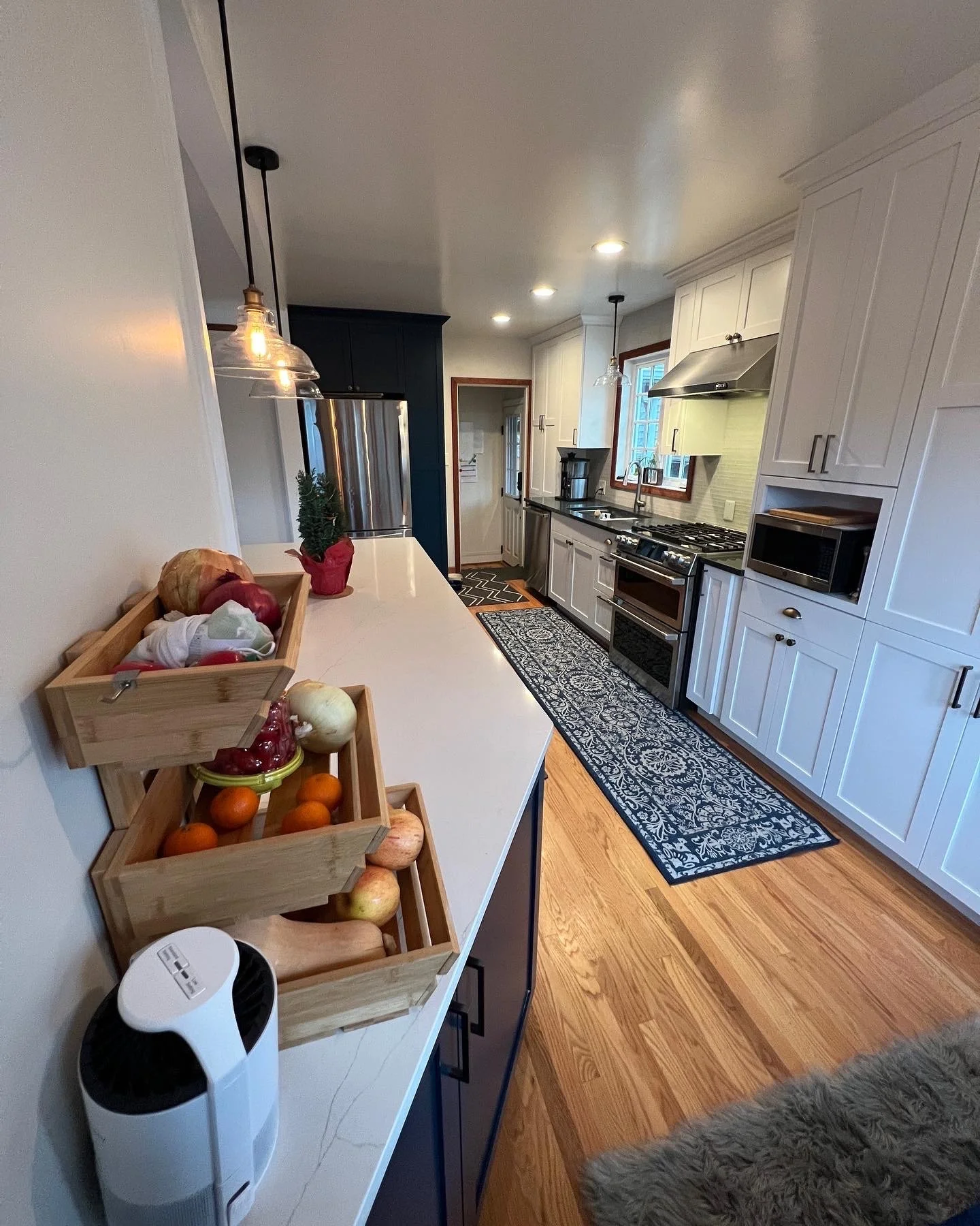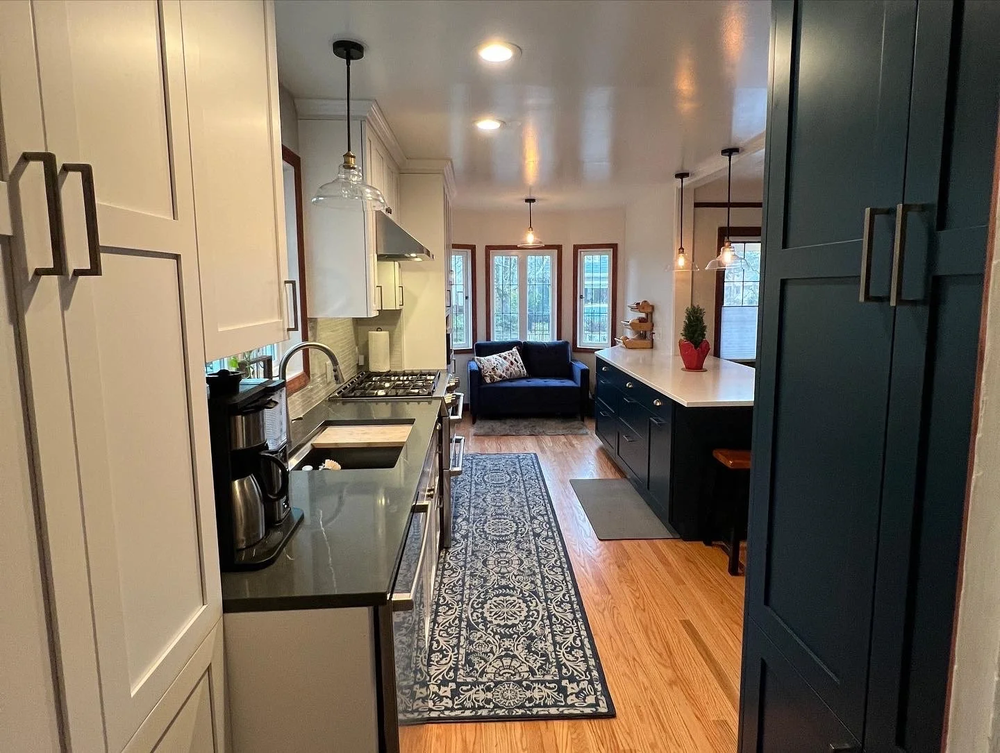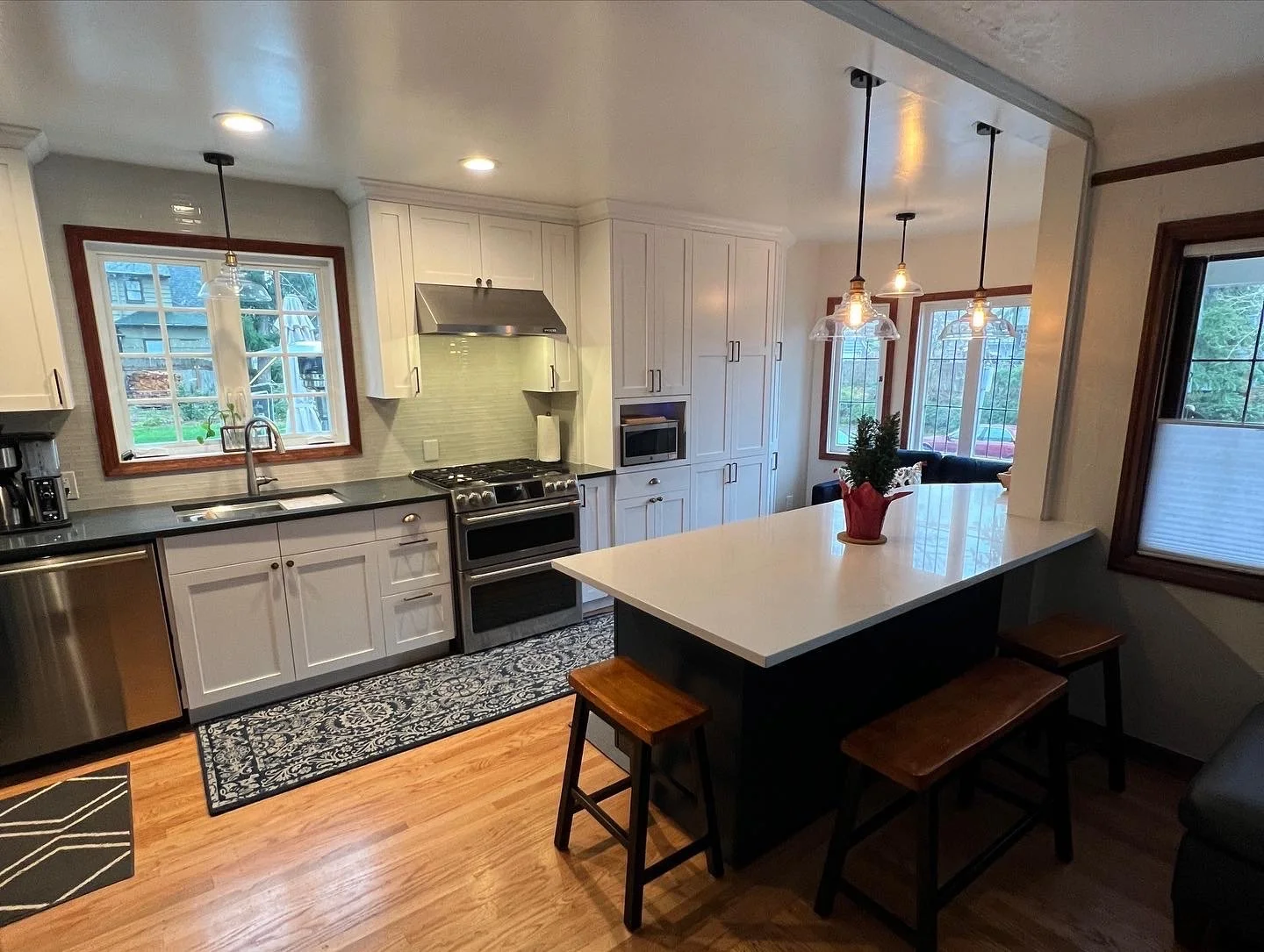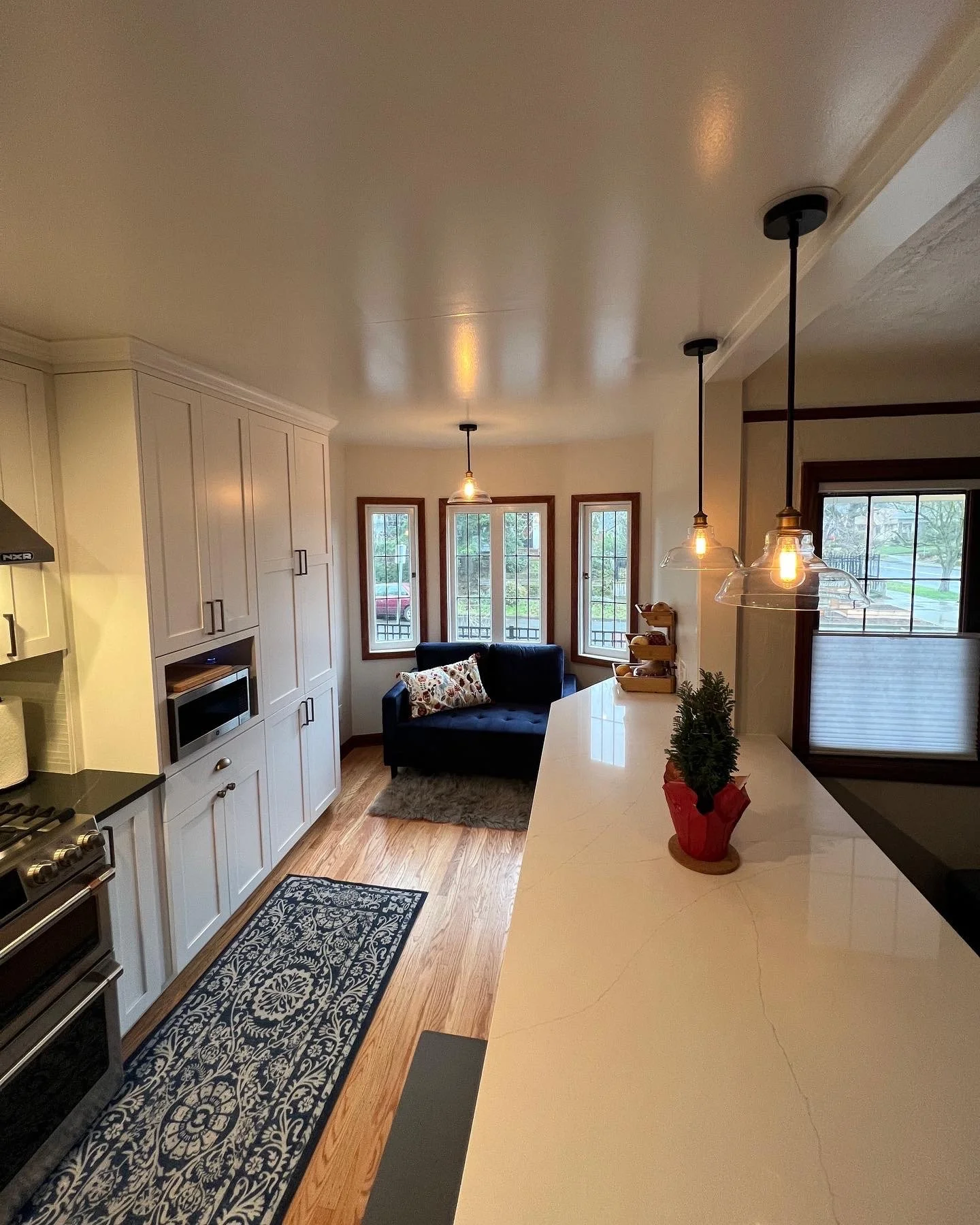 A family of 4 was looking for an expansion that allows for more space to gather together in the beacon of this 1940s home. Removing the load bearing wall, reframing with some new beams ( exposed and hidden), adding an array of storage, tile, resurfacing these beautiful oak floors, brings attention to the island they all share in the afternoons to reminisce the days stories.